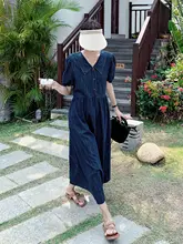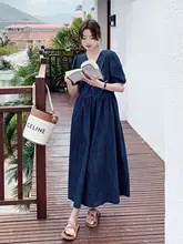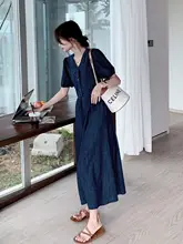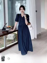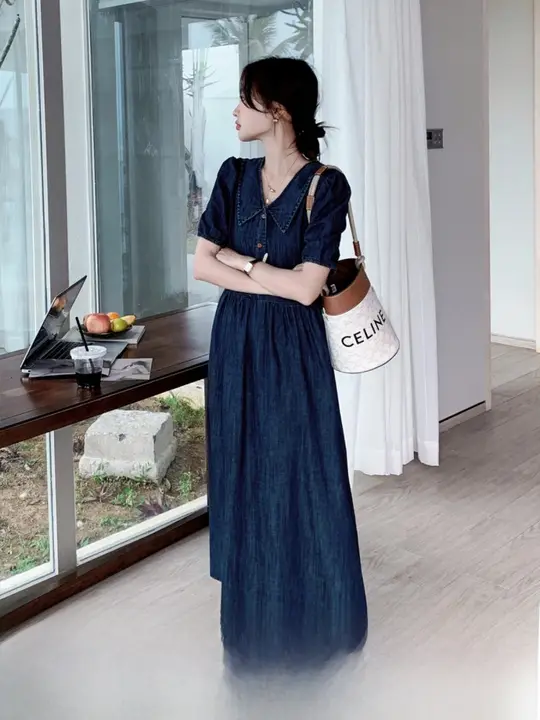 深い青色のデニムワンピース【フランス風・ウエスト絞り・ロング丈・レトロな雰囲気】