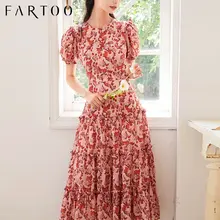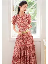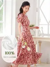 フラワープリント真丝ワンピース【泡袖・中長丈・ティータイムスタイル】