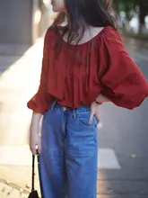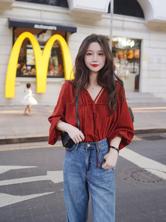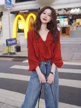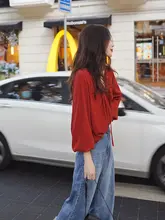 春用 レッド 天絲 リバーシブル Vネック 通勤用 カジュアル シャツ【リボンデザイン・ルーズフィット・UVカット】