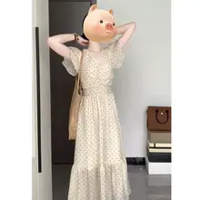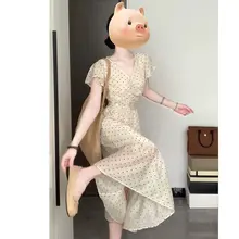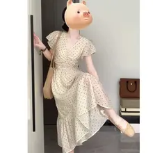 大きいサイズのドット柄Vネック短袖ワンピース【夏用・ウエスト絞り・ロング丈・エレガント】