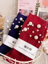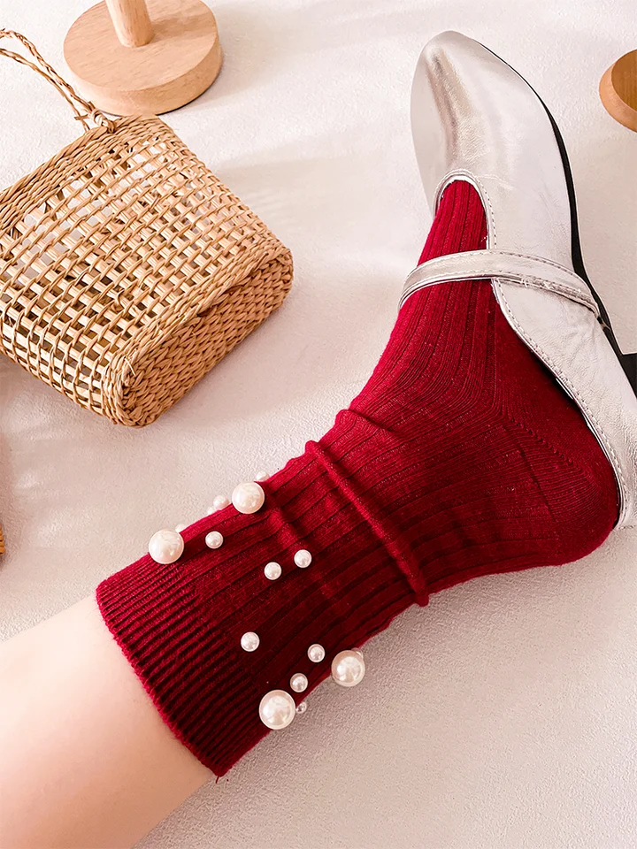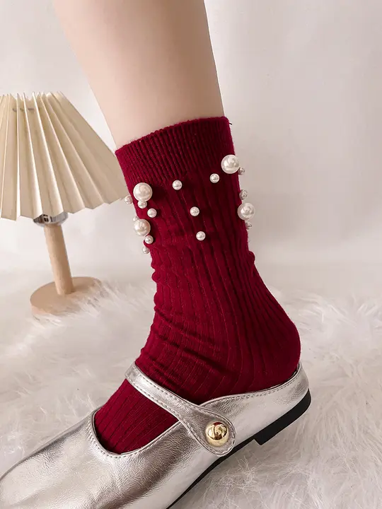 安可拉 パール付きソックス【秋冬・ワインレッド・ブラック・中筒・レディース】