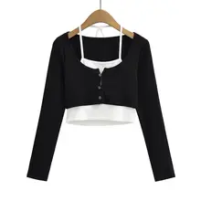 コントラストカラーのホルターネック長袖-ブラック-モデルスタイル