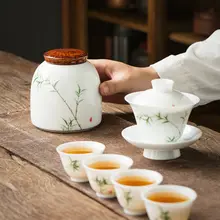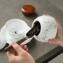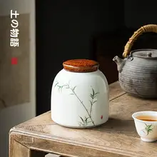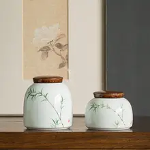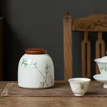 手描き青竹デザインの茶葉保存缶【高級感ある白磁・小型・陶器製】
