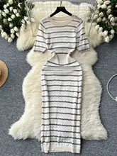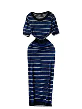カラーブロックストライプのニットワンピー��ス【レディース・シルエットを美しく見せる・ラウンドネック・半袖・ロングドレス】