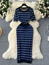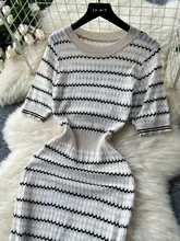 カラーブロックストライプのニットワンピース【レディース・シルエットを美しく見せる・ラウンドネック・半袖・ロングドレス】