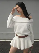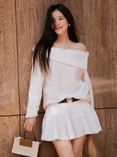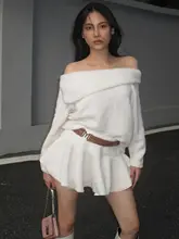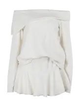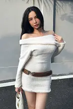 白色毛足のあるフリル襟オフショルダーワンピース【長袖・ミニ丈】