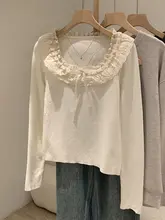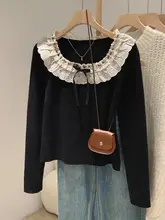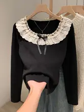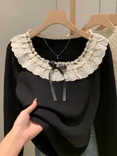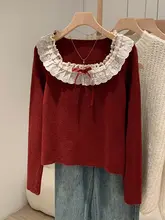 レースフリル付き長袖ニットトップス【春秋用・リボンデザイン・女性用】