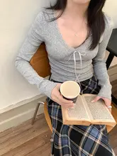 レディースVネックレース付き長袖Tシャツ【春秋・リボンデザイン・タイトフィット】