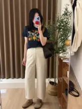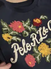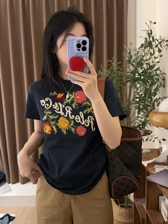 花柄刺繍のレディースショートスリーブTシャツ【体型カバー・ラウンドネック】