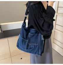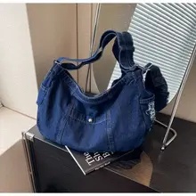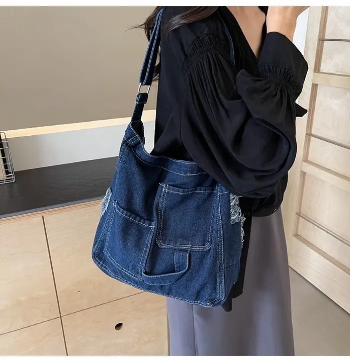 デニム生地のトートバッグ【大容量・ショルダー&斜め掛け対応・カジュアルデザイン】(セットアップ対応)