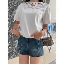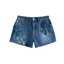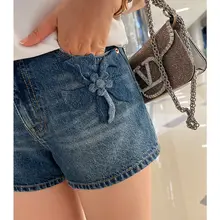 手作り立体花デザインのカジュアルデニムショートパンツ【ブルー・ヴィンテージウォッシュ】