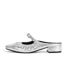 真皮のシルバー皺デザインミュールスリッパ【女性用・春夏・太ヒール・クローズドトゥ】