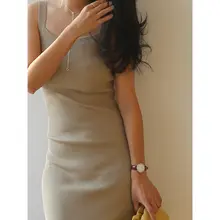 カキ色のシンプルなニットキャミソールワンピース【夏用・膝下丈・スタイルアップ効果】(セッ��トアップ対応)