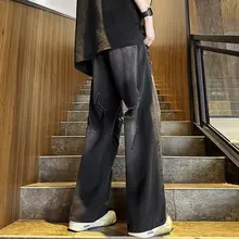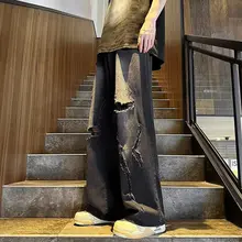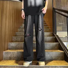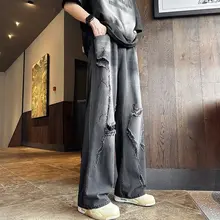 黒灰色 デニムパンツ【メンズ・夏用・ゆったり・ビッグシルエット・ダメージデザイン】