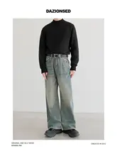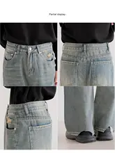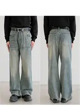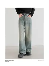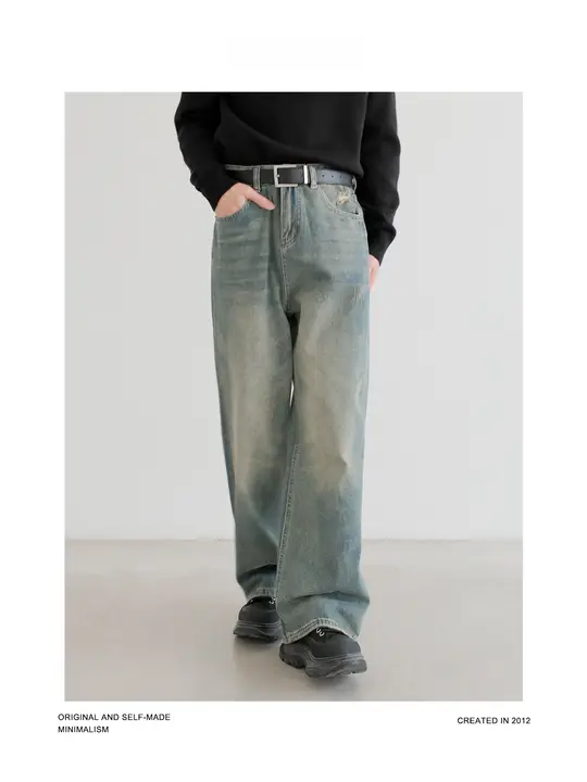 レトロブルーのストレートデニムパンツ【ゆったりサイズ・ウォッシュ加工・カジュアル】