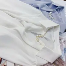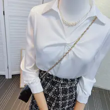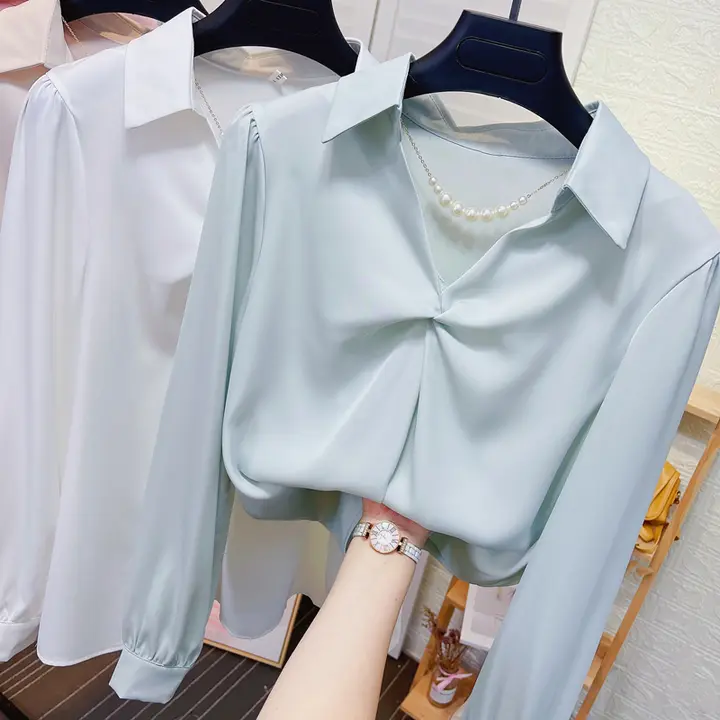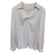 ネックラインデザインのVネック長袖ブラウス【サテン・秋用・ゆったりフィット・オフィス対応】