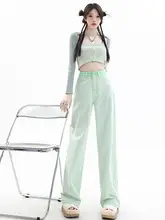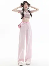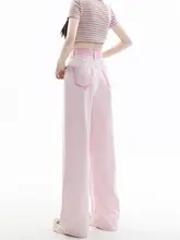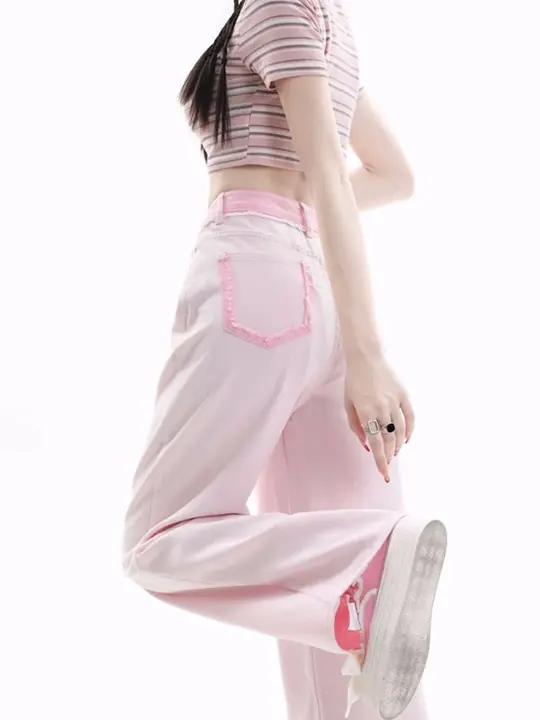 夏用ピンクデニムパンツ【薄手・ハイウエスト・梨型体型対応・トレンドデザイン・裾広がり】