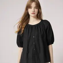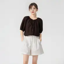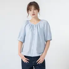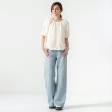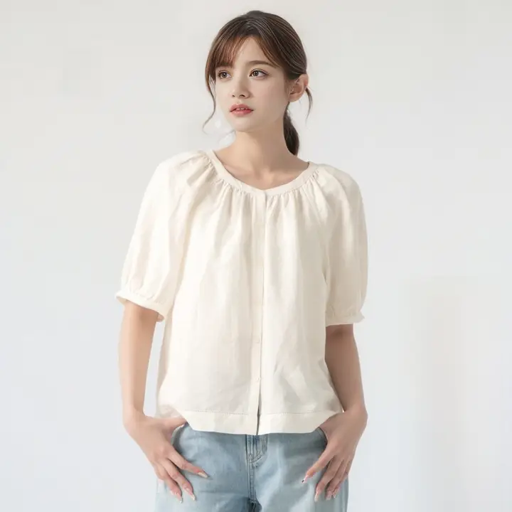 麻混紡 バルーンスリーブシャツ【短袖・プリーツデザイン・春夏用】