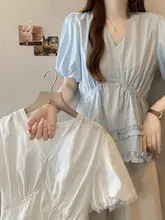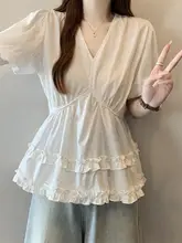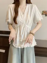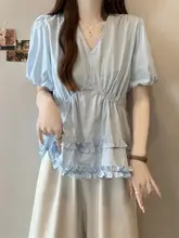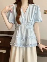 木製耳エッジ裾 浅蓝色 Vネック半袖 シャツ 女性