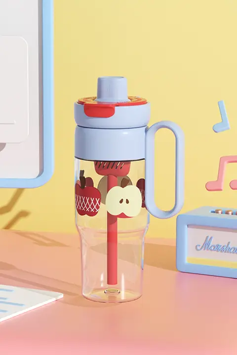 ストロー付きで飲みやすく、片手で操作できる便利な構造。デスクワークの間も使いやすい。