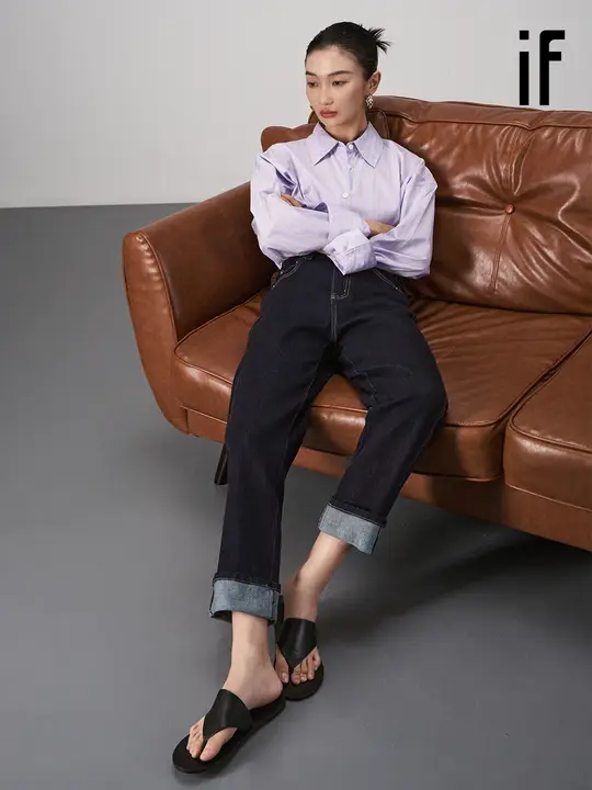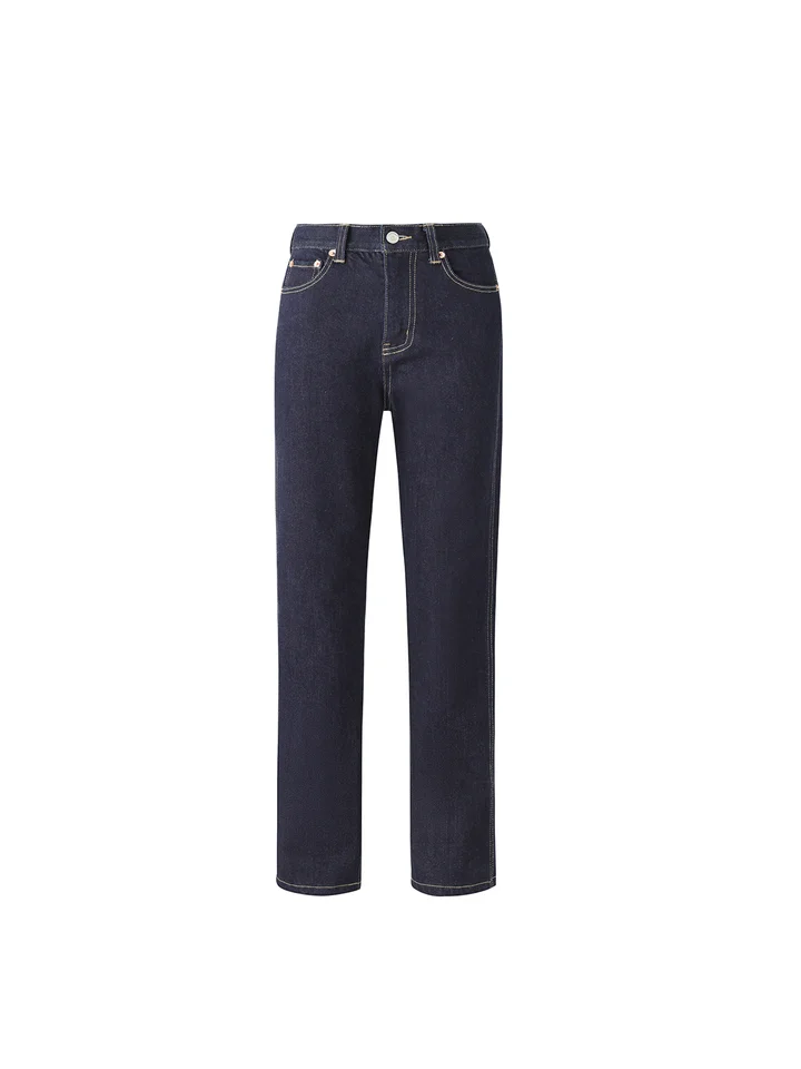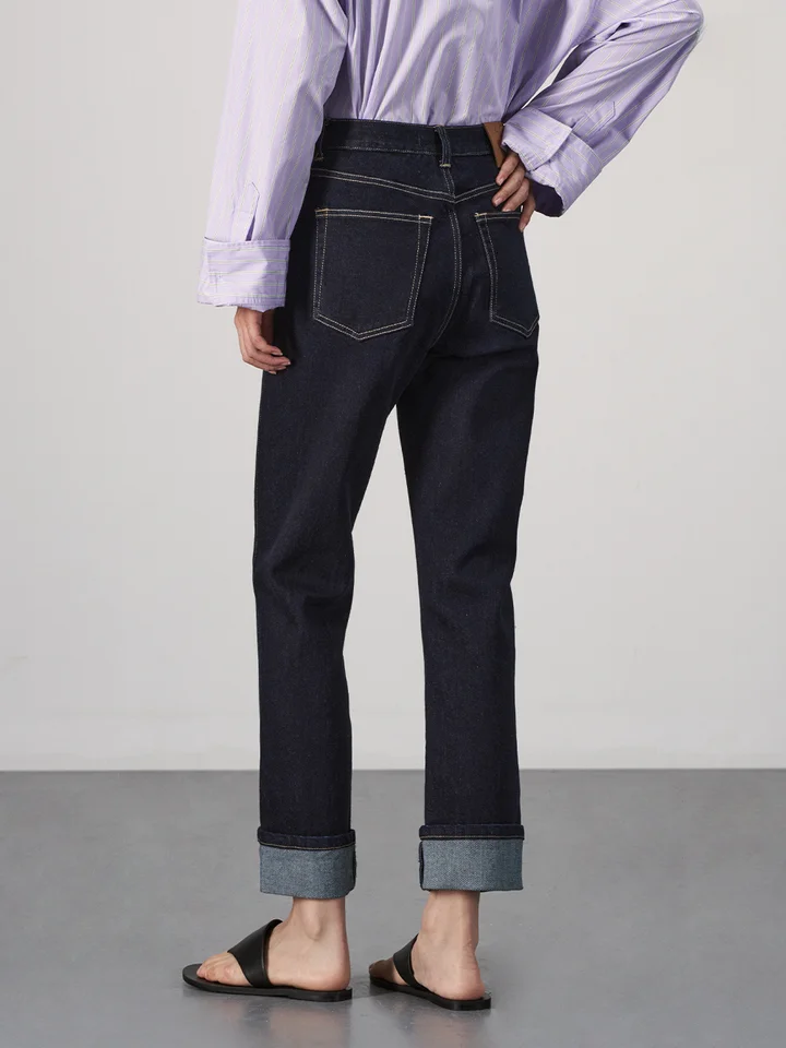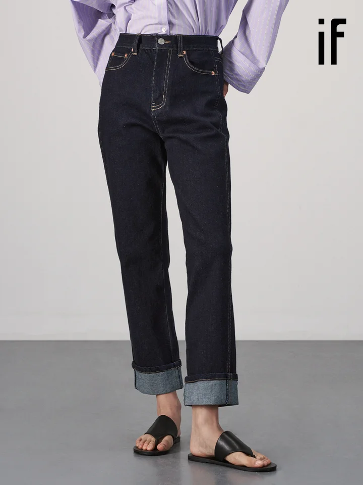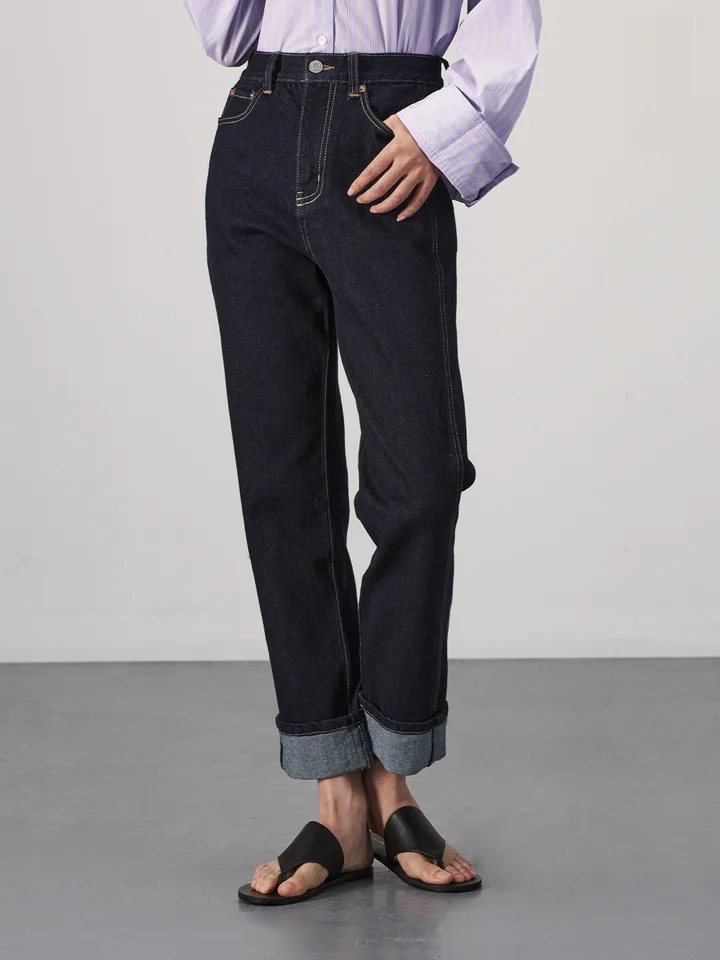 ハイウエストストレートデニムパンツ【レトロスタイル・裾翻り・美脚効果】(セットアップ対応)