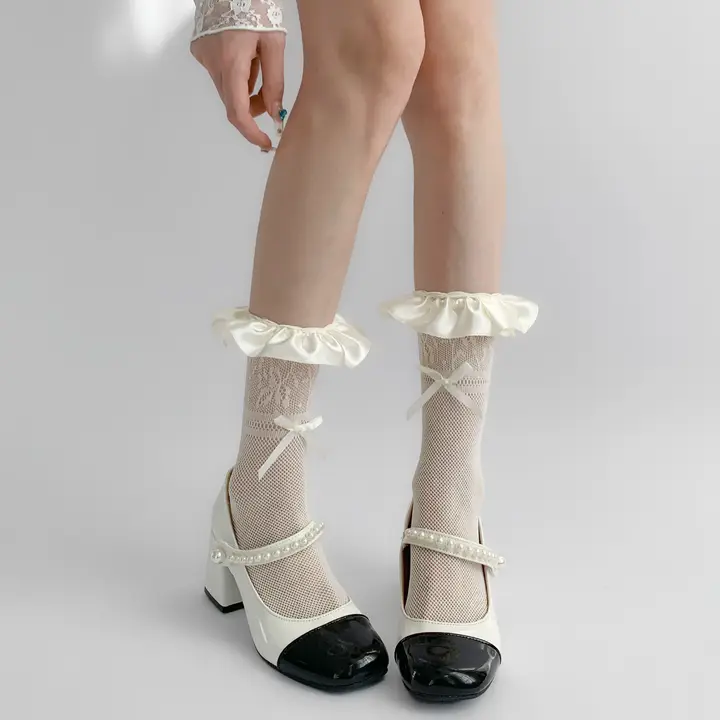 レースデザイン中筒ソックス【透湿・メッシュ・リボン付き・秋用】