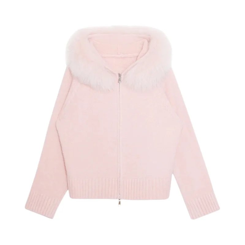 NMIOK フォックスファー付きフードニットカーディガン【レディース・秋冬用・おしゃれ】