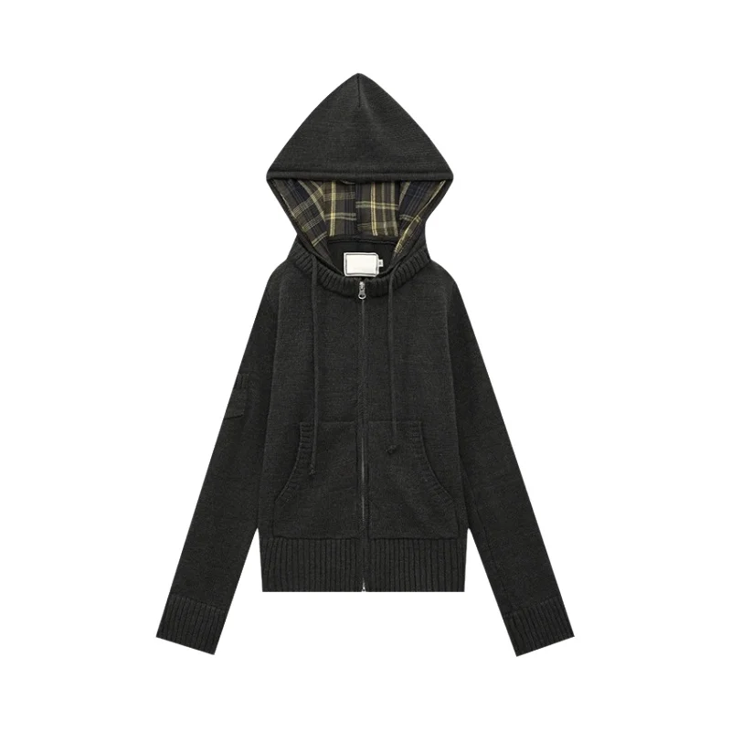 チェック柄フード付きニットカーディガン【秋冬用・スリムフィット・女性用】
