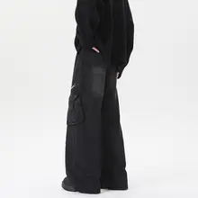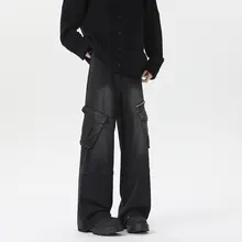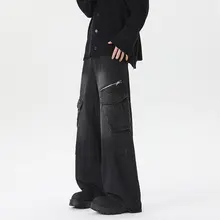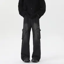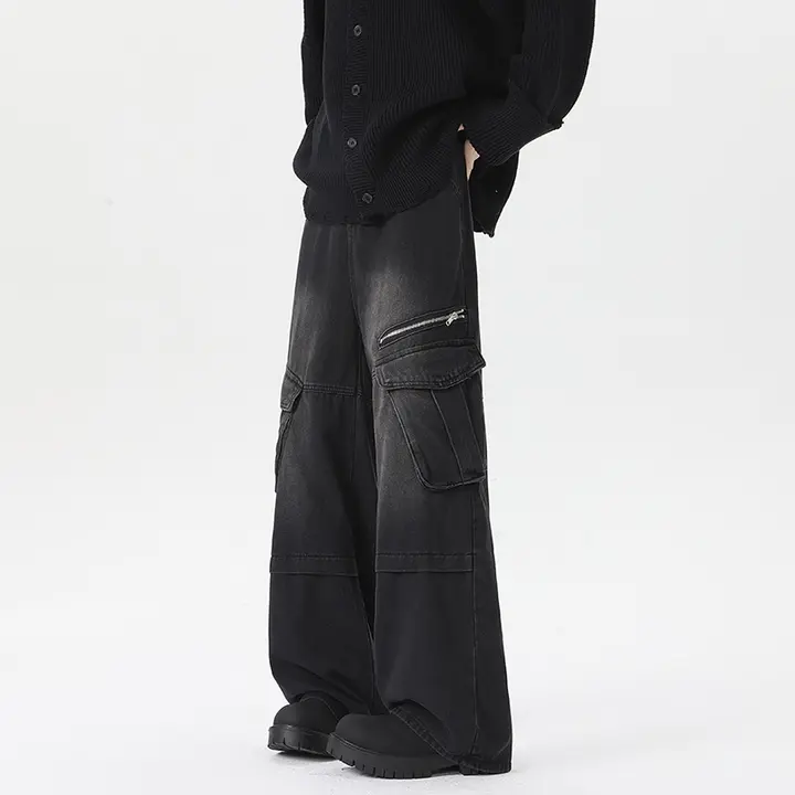 水洗加工の多ポケットワイドレッグデニムパンツ【メンズ・秋春用・ゆったりしたカジュアルスタイル】