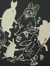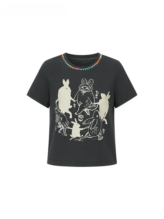 グレーのラウンドネックウサギプリント半袖Tシャツ【女性用・デザインアクセント付き】